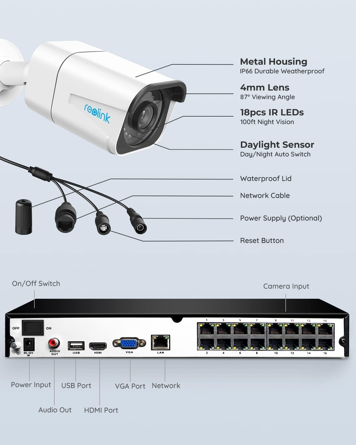 REOLINK 4K Security Camera System, RLK16-800B8 8pcs H.265 PoE Wired with Person Vehicle Detection, 8MP/4K 16CH NVR with 4TB HDD for 24-7 Recording