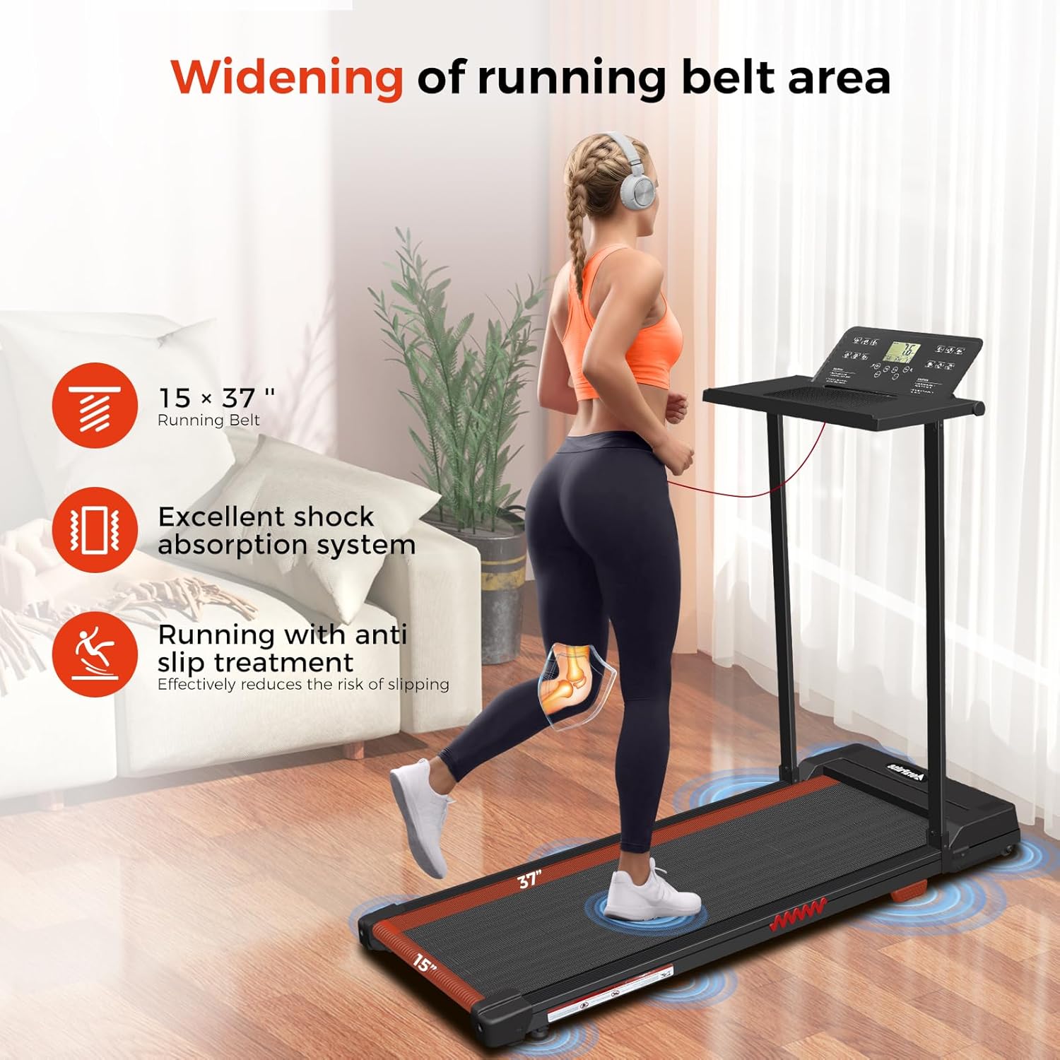 【Wide Running Belt Treadmill】The treadmill has a spacious running surface, measuring 15 x 37 inches, providing ample space for you to take your steps freely. Enjoy a natural and smooth running experience. High quality anti slip running and stable structural design effectively reduce the risk of slipping and collision, providing reliable safety guarantee for your exercise.