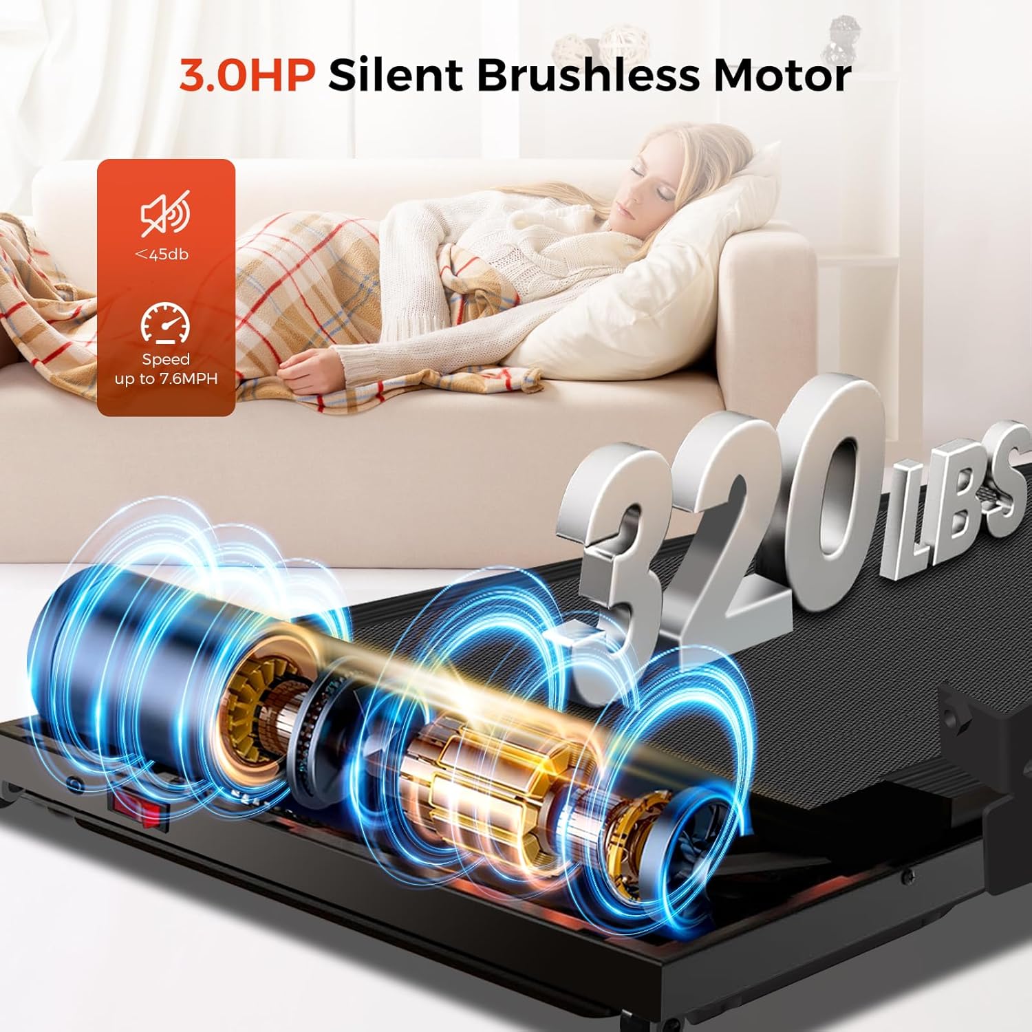 【Comfortable Running Experience】Equipped with a 3.0 HP silent brush-less motor, with a maximum load of 320 pounds. Even when used during family rest, it will not cause interference and create a quiet and comfortable exercise environment for you. The speed range is from 0.6-7.6 MPH, and you can choose different running speeds according to your needs to achieve the best sports experience.